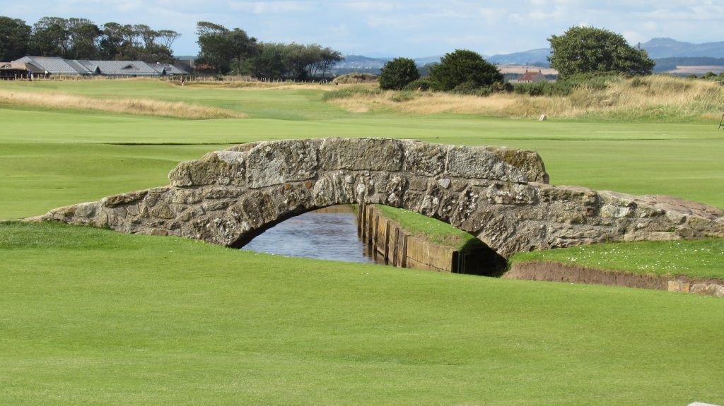 Often called the Swilken Bridge, this is actually one of three bridges over the Swilken Burn and was always known as the PackHorse Bridge. It is estimated to be about 700 years old and it was Old Tom Morris who banked up earth around it to protect it. Only about the top third is visible now. It is often used for Golf Tournament winners when posing with their trophies.